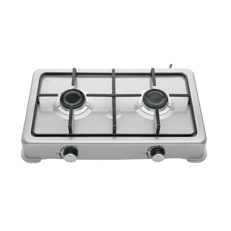 Parrilla de gas de sobreponer FOSÉT AERO con cuerpo de acero inoxidable en una sola pieza, 2 quemadores de alto rendimiento y controles seguros. Resistente, práctica y perfecta para cocinas compactas