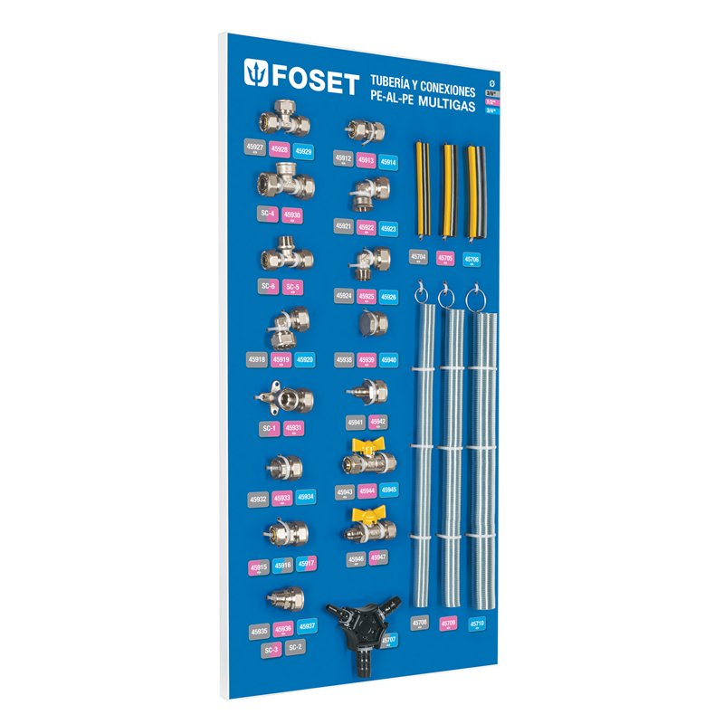 Exhibidor FOSET para conexiones PE-AL-PE, fabricado en MDF y listo para colgar. Incluye piezas reales para mostrar al cliente cada conexión y accesorio. Ideal para tiendas y demostraciones.